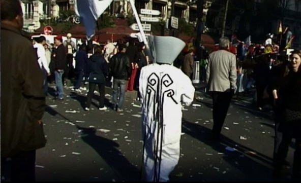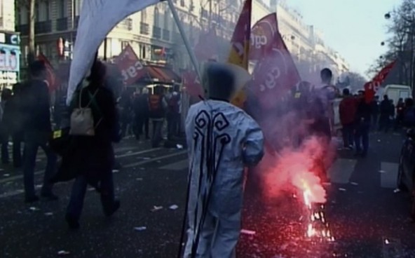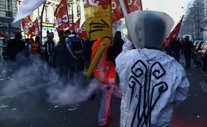 Paris manifestacion. enarbolando la bandera de su propia republica, louis Eden, intervino durante mas de 3 horas, mezclandose con los sindicatos u asociaciones militantes, que no dejaron de mirar con desconfianza a este representante unico, de un partido, u organizacion desconocida.