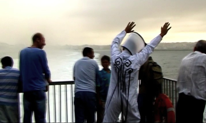 Embarcacion, estrecho de Gibraltar Atravezando el estrecho de Gibraltar en una embarcacion aerodinamica, Louis Eden aparecio por la borda, sorprendiendo a las mas de 500 personas, que atravezaban el estrecho rumbo a Europa.