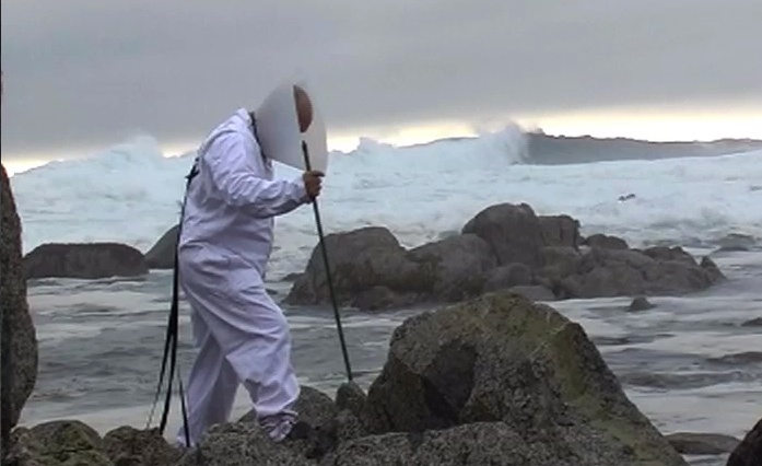 Chile Apareciendo detras de unas rocas en el litoral pacifico chileno, balneario de Punta de Tralca.