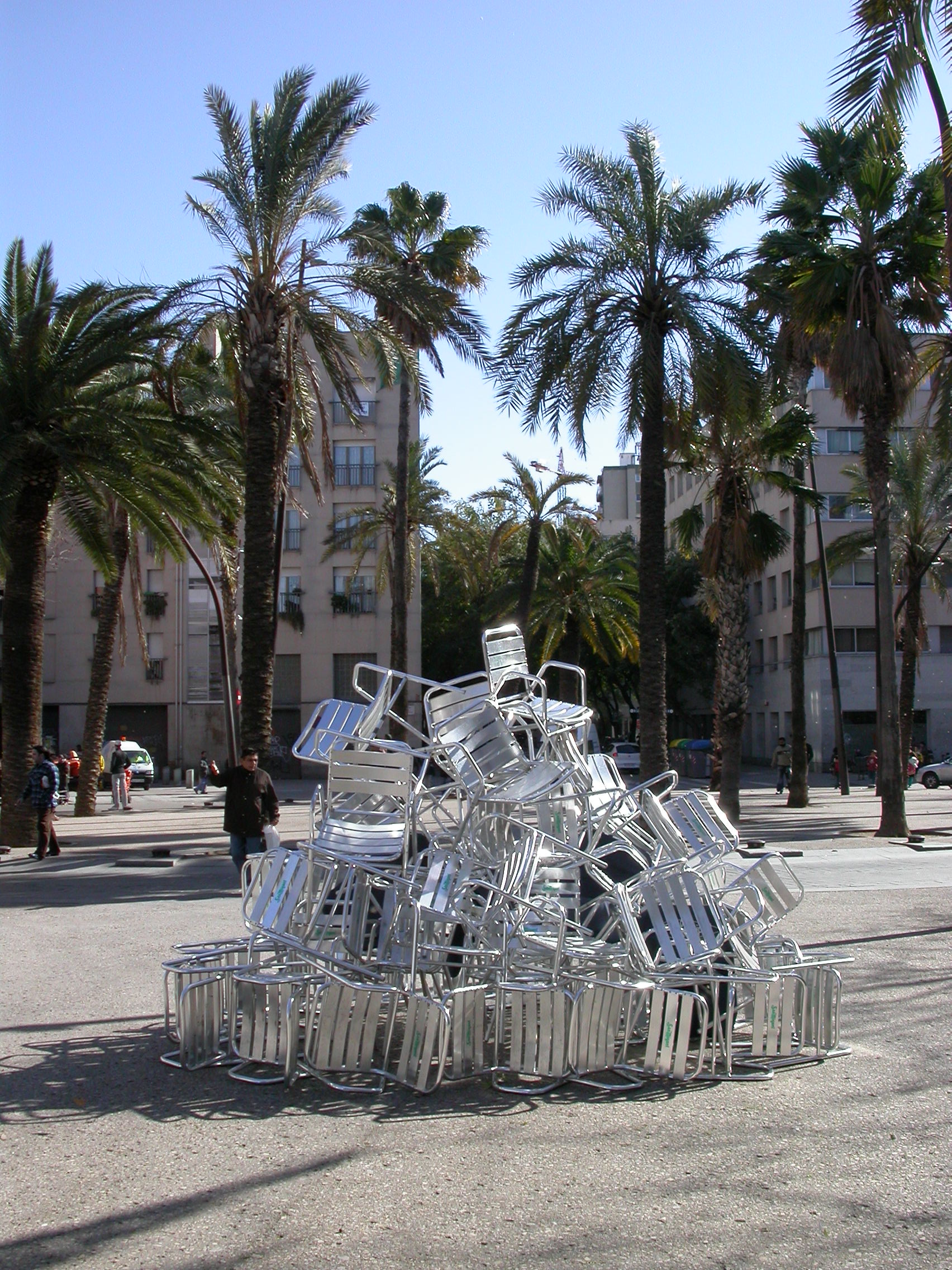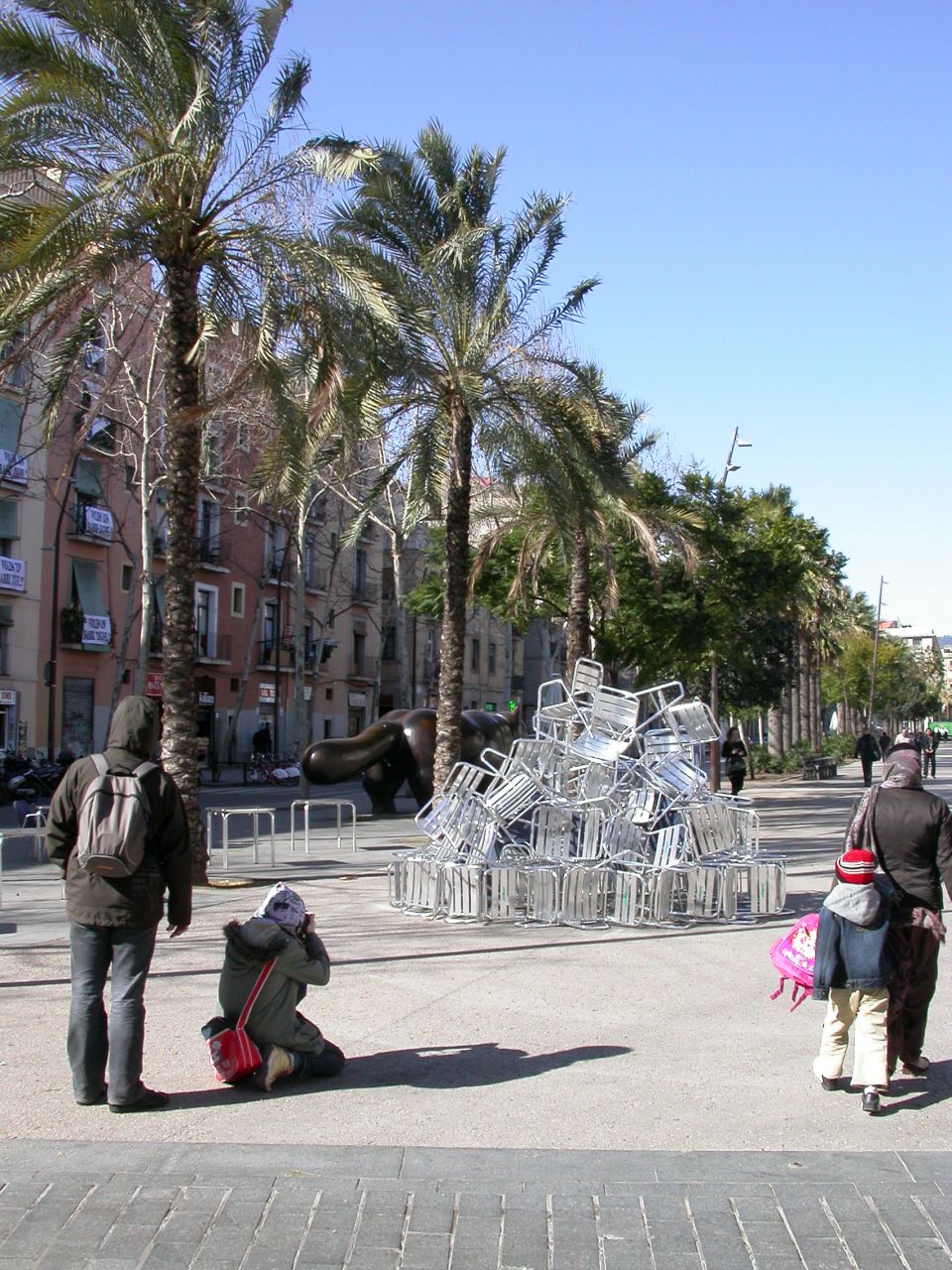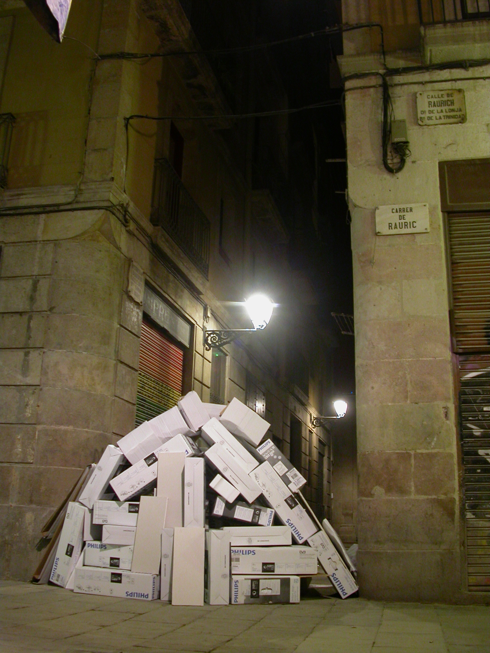 She moves in the road system of cities leaving traces: hills of the same basic structure, differing in size and material, responding to the realities of urban space. Her activities include the material of the city: bulky waste, garbage, packaging materials, wood, stones, scrap metal. Depending on space and time she piles up the urban material to clusters. The hills are up to four meters high and six meters wide. It doesn?t take more than a few minutes to create them, only sometimes a few hours. Forming these hills depends on the nature of the material ? its structure, form, colour, consistency.
