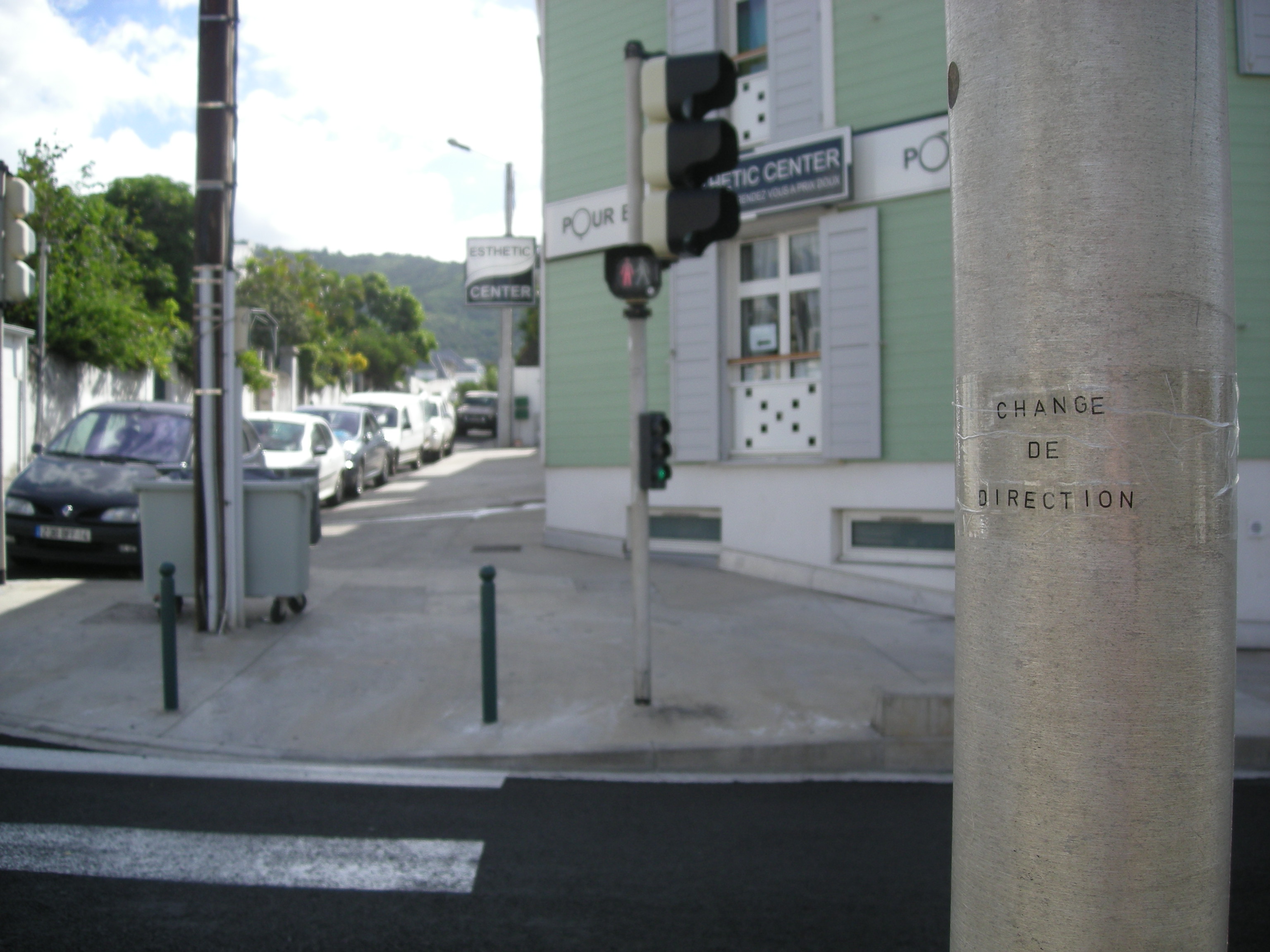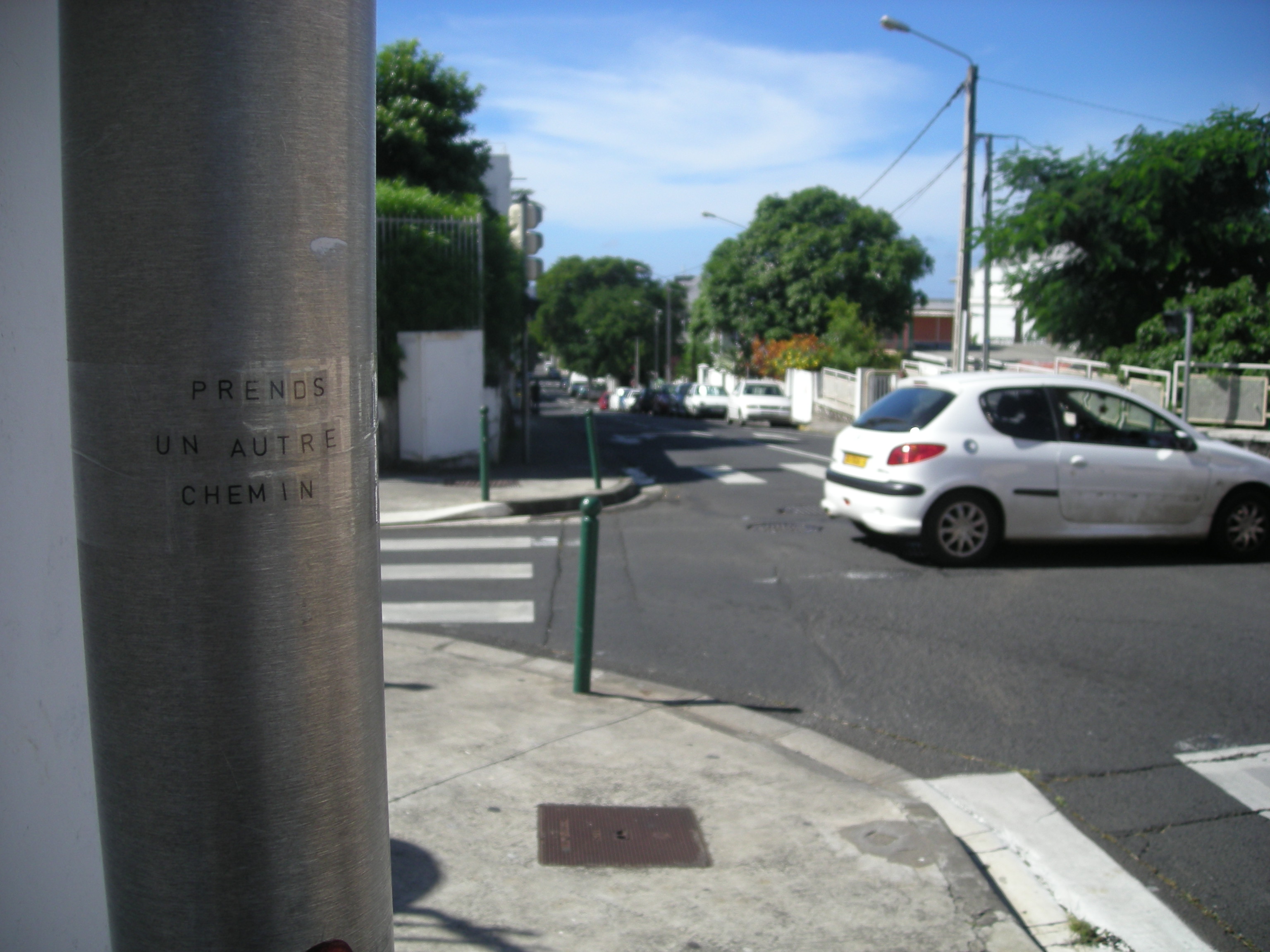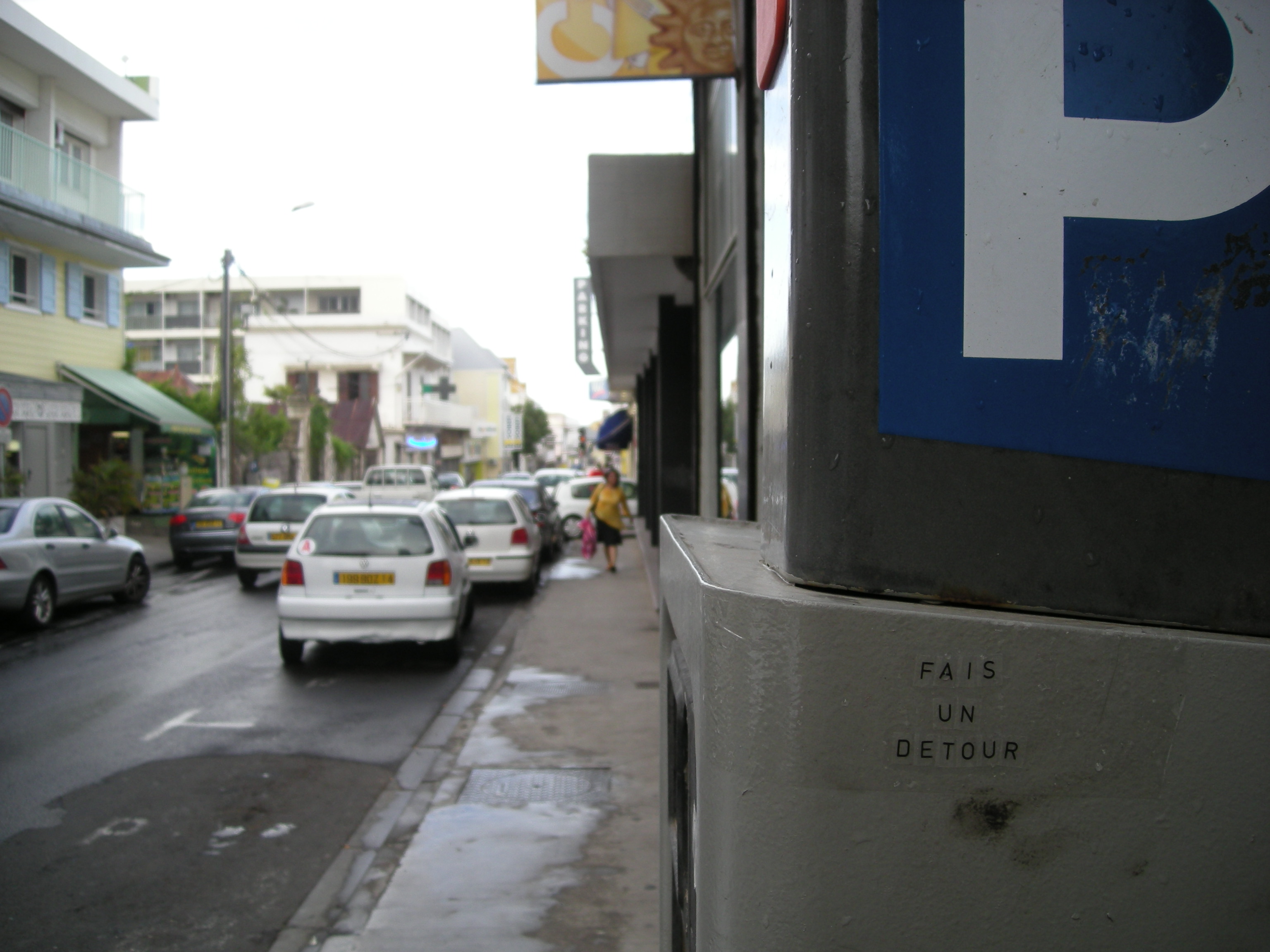 I pasted sentences for pedestrians on the poles, benches and parking meters of the city where I lived in Reunion Island. They were written using adhesive letters, pasted at eye level, and were constructed as rules of play, they offered to pedestrians to imagine other routes, even shoving their plans.