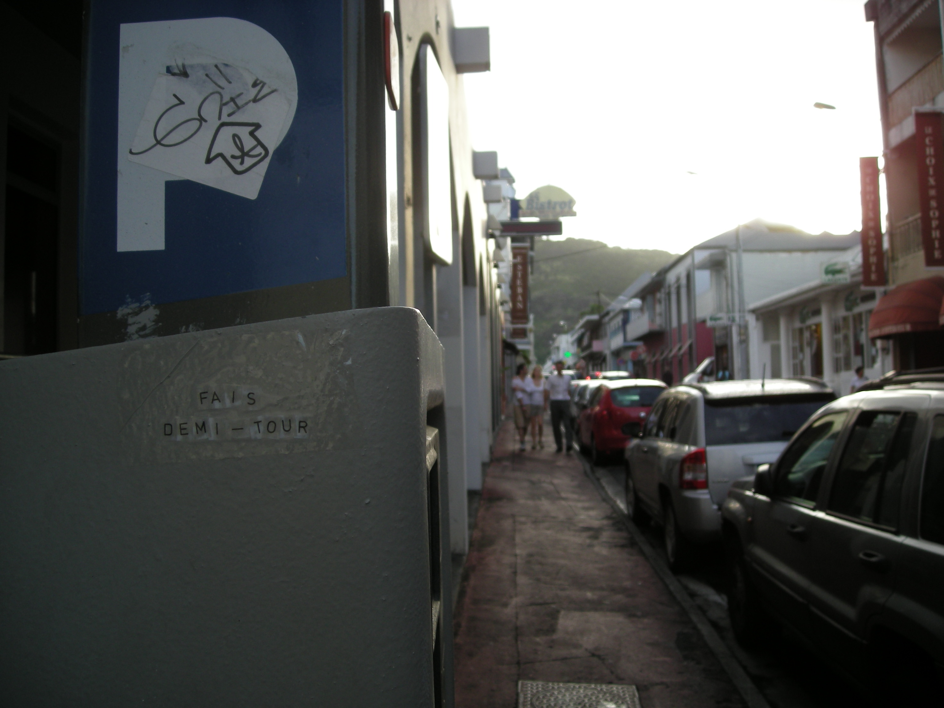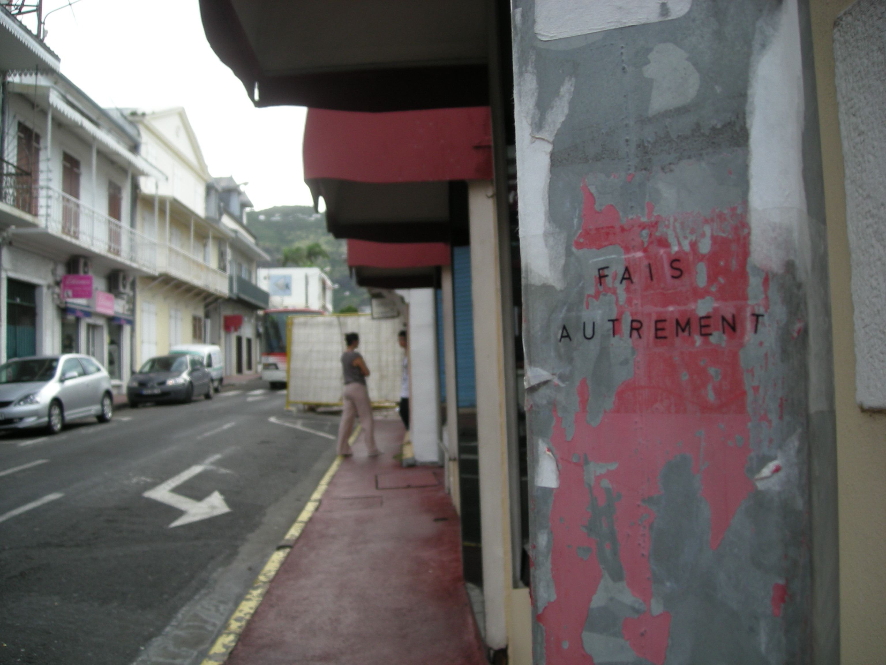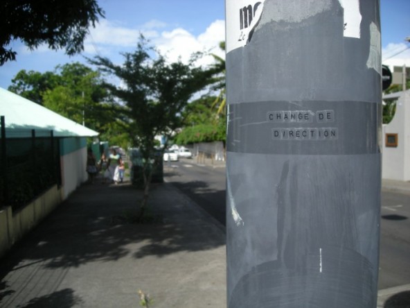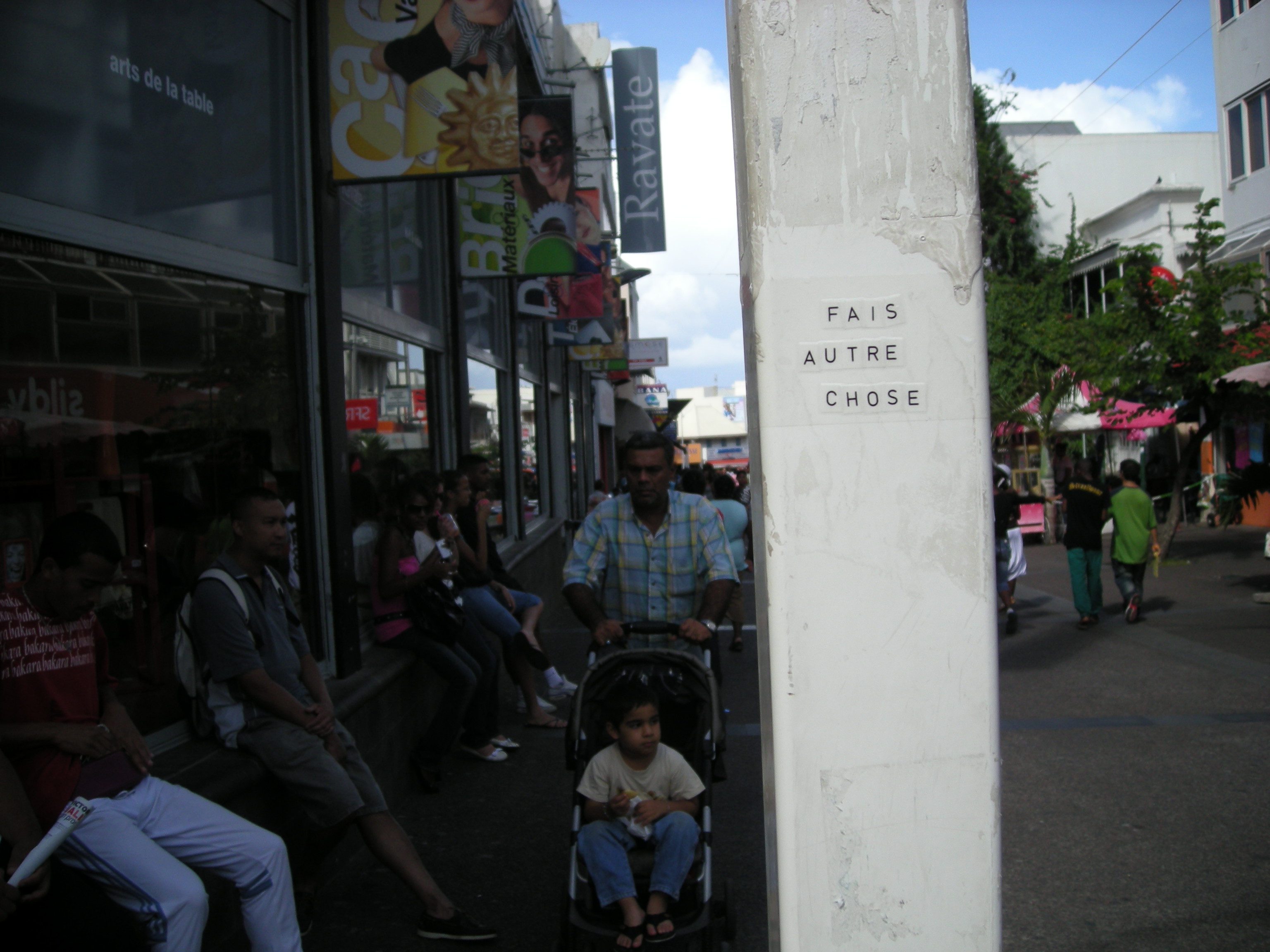 I pasted sentences for pedestrians on the poles, benches and parking meters of the city where I lived in Reunion Island. They were written using adhesive letters, pasted at eye level, and were constructed as rules of play, they offered to pedestrians to imagine other routes, even shoving their plans.