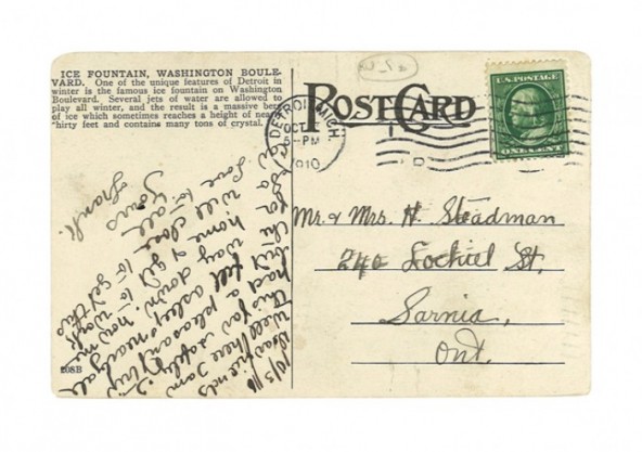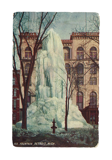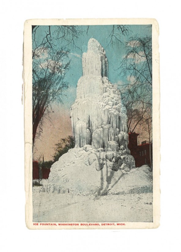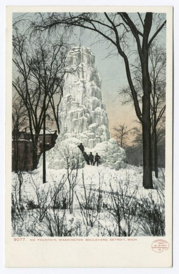 Detroit circa 1917. Ice Fountain, Washington Boulevard. One of the unique features of Detroit in winter is the famous ice fountain on Washington Boulevard. Several jets of water are allowed to play all winter, and the result is a massive berg of ice which sometimes reaches a height of nearly thirty feet and contains many tons of crystal.