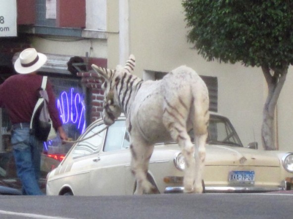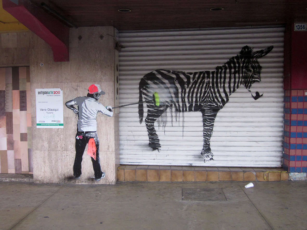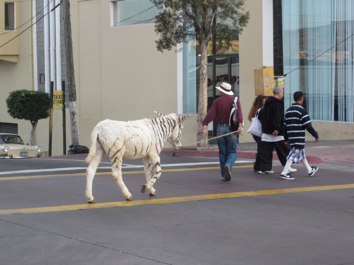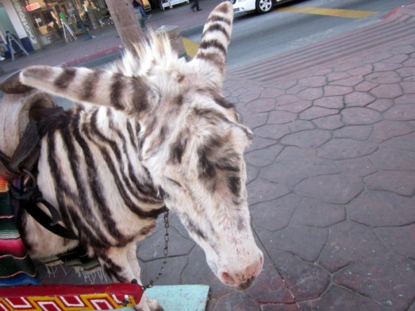 Tijuana zebras have been a popular tourist attraction in Tijuana, Mexico, a city that borders the United States, since the 1940s. The Tijuana painted donkey or Tijuana Zebra, came about some time in the middle of the twentieth century, the reason for painting the donkeys was to ensure that the animal be seen in photographs. Since the donkeys were mostly white, on sunny days with the old black and white cameras the donkey would be seen as a ghostly figure. A long-time tourist staple, the donkeys live on a hillside below the Casa de la Cultura in Tijuana.