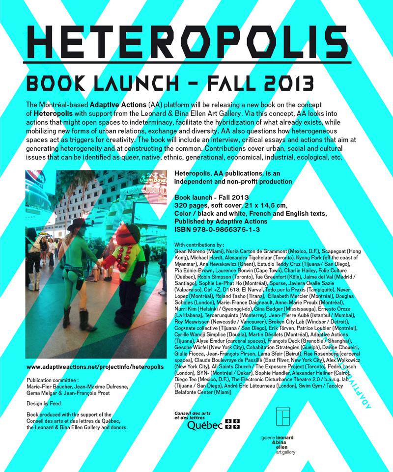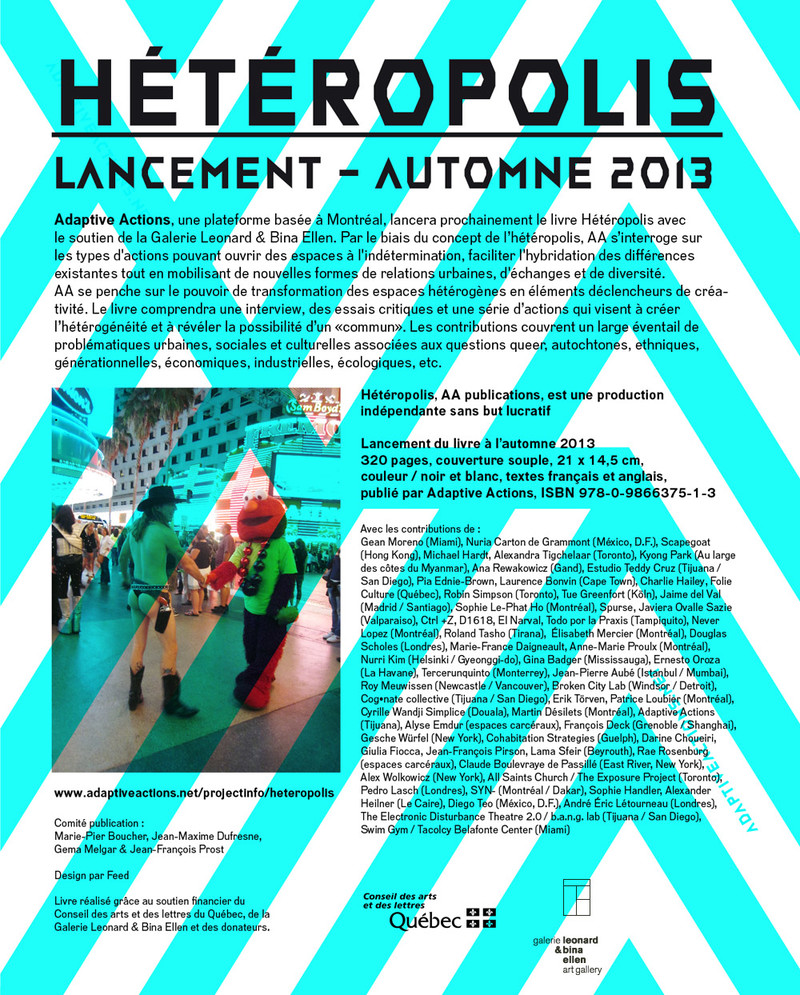 With contributions by: Gean Moreno (Miami), Nuria Carton de Grammont (México, D.F.), Scapegoat (Hong Kong), Michael Hardt, Alexandra Tigchelaar (Toronto), Kyong Park (off the coast of Myanmar), Ana Rewakowicz (Gand), Estudio Teddy Cruz (Tijuana / San Diego), Pia Ednie-Brown, Laurence Bonvin (Cape Town), Charlie Hailey, Folie Culture (Québec), Robin Simpson (Toronto), Tue Greenfort (Köln), Jaime del Val (Madrid / Santiago), Sophie Le-Phat Ho (Montréal), Spurse, Javiera Ovalle Sazie (Valparaiso), Ctrl +Z, D1618, El Narval et Todo por la Praxis (San Pedro Garza Garcia), Never Lopez (Montréal), Roland Tasho (Tirana), Élisabeth Mercier (Montréal), Douglas Scholes (Londres), Marie-France Daigneault et Anne-Marie Proulx (Montréal), Nurri Kim (Helsinki / Gyeonggi-do), Gina Badger (Mississauga), Ernesto Oroza (La Havane), Tercerunquinto (Monterrey), Jean-Pierre Aubé (Istanbul / Mumbai), Roy Meuwissen (Newcastle / Vancouver), Broken City Lab (Windsor / Detroit), Cog•nate collective (Tijuana), Erik Törven, Patrice Loubier (Montréal), Cyrille Wandji Simplice (Douala), Martin Désilets (Montréal), Adaptive Actions (Tijuana), Alyse Emdur (espaces carcéraux), François Deck (Grenoble / Shanghai), Gesche Würfel (New York), Cohabitation Strategies (Guelph), Darine Choueiri, Giulia Fiocca, Jean-François Pirson et Lama Sfeir (Beyrouth), Rae Rosenburg (espaces carcéraux), Claude Boullevraye de Passillé (East River, New York), Alex Wolkowicz et Jon Barraclough (New York), All Saints Church / The Exposure Project (Toronto), Pedro Lasch (Londres), SYN- (Montréal / Dakar), Sophie Handler, Alexander Heilner (Le Caire), André Éric Létourneau (Londres), The Electronic Disturbance Theatre 2.0 / b.a.n.g. lab (Tijuana / San Diego), Swim Gym / Tacolcy Belafonte Center (Miami)