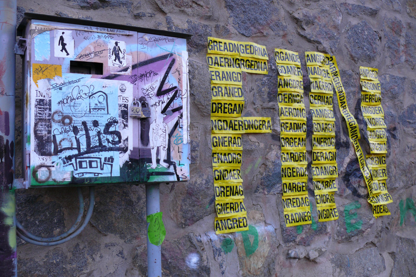 I started this project during my residency at the Darling Foundry in the winter of 2006 in Montreal, Canada. I made 100 anagrams of Danger and I started to installed them in different cities. The rule of the game is to find words that mean something in Spanish, French and eventually in English. Fin was installed in Valparaiso, Plazuela Ascensor Cerro Reina Victoria.